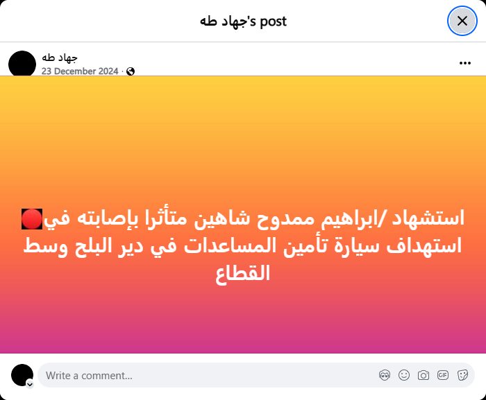 استشهاد /ابراهيم ممدوح شاهين متأثرا بإصابته في استهداف سيارة تأمين المساعدات في دير البلح وسط القطاع
