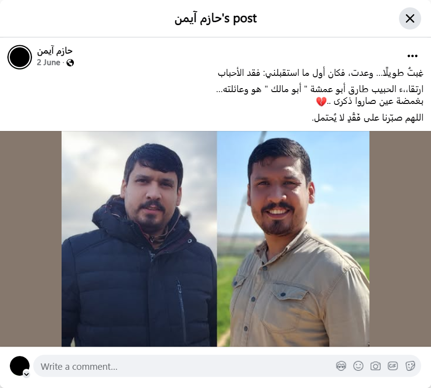 I was gone for a long time... I returned, and the first thing that greeted me was: the loss of loved ones and the ascension of the beloved Tariq Abu Amsha "Abu Malik" and his family... In the blink of an eye they became a memory... O God, give us patience in this unbearable loss.
