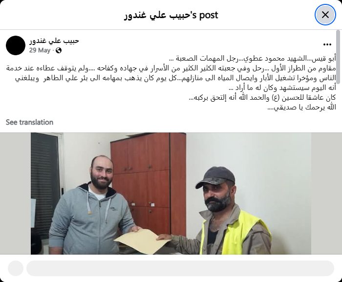 A first-class resistance fighter... He departed with many, many secrets from his jihad and struggle... His giving did not stop at serving the people, and most recently, operating the wells and delivering water to their homes... Every day he would go on his mission to the well of Ali al-Tahir and inform me that today he would be martyred, and he got what he wanted...