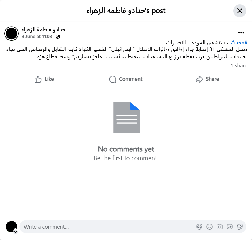 #Update: Al-Awda Hospital - Nuseirat: 31 people were injured when Israeli drones fired bombs and live bullets at crowds of civilians near the aid distribution point in the vicinity of the so-called "Netzarim checkpoint" in the central Gaza Strip.