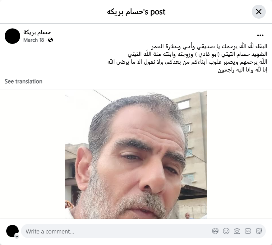 May God have mercy on you, my friend, brother, and lifelong companion. The martyr Hussam Al-Titi (Abu Fadi), his wife, and his daughter, Mona Allah Al-Titi. May God have mercy on them and grant patience to the hearts of your children after you. We only say what pleases God. To God we belong and to Him we shall return.