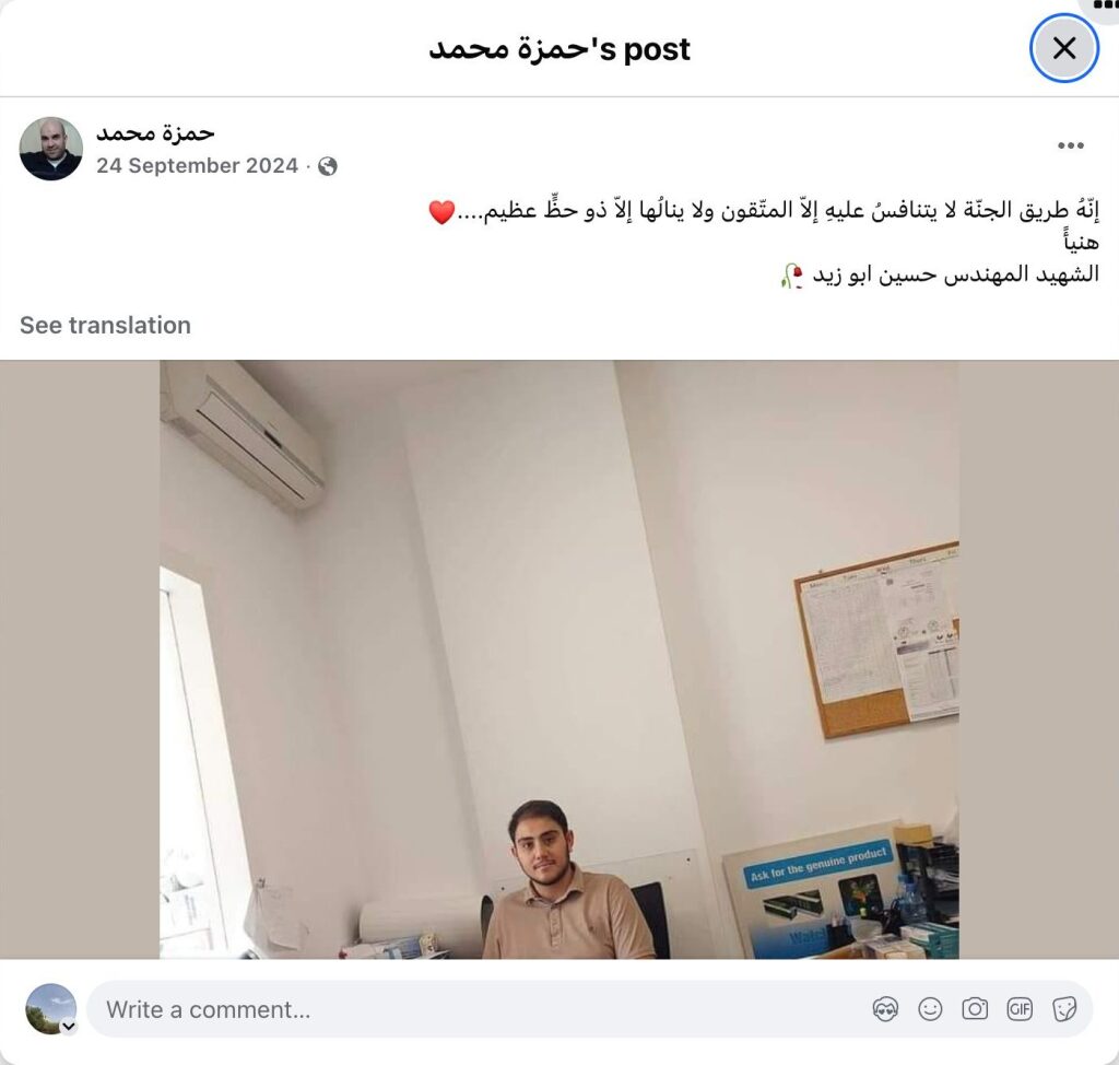 It is the path to Paradise, a path only the righteous strive for, and only those of great fortune attain it... Congratulations to the martyr, Engineer Hussein Abu Zeid.
