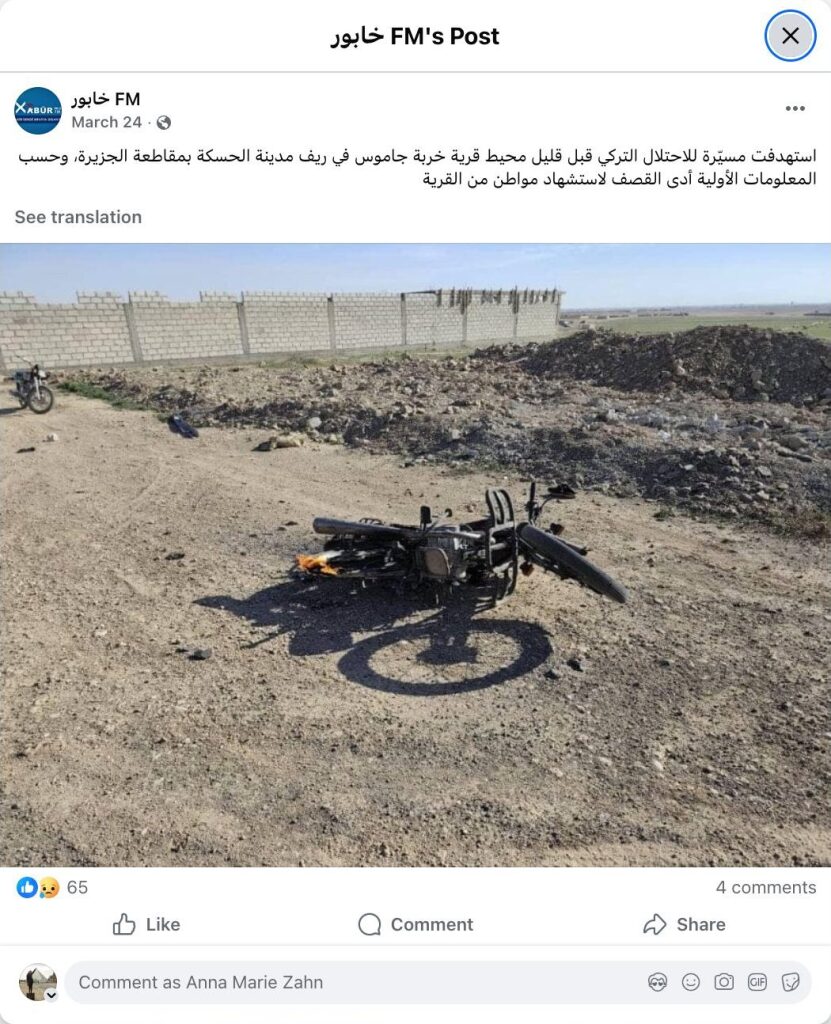 A Turkish occupation drone targeted the vicinity of Khirbet Jammous village in the Hasakah countryside of Al-Jazira province a short while ago. According to initial reports, the bombing resulted in the death of a villager.