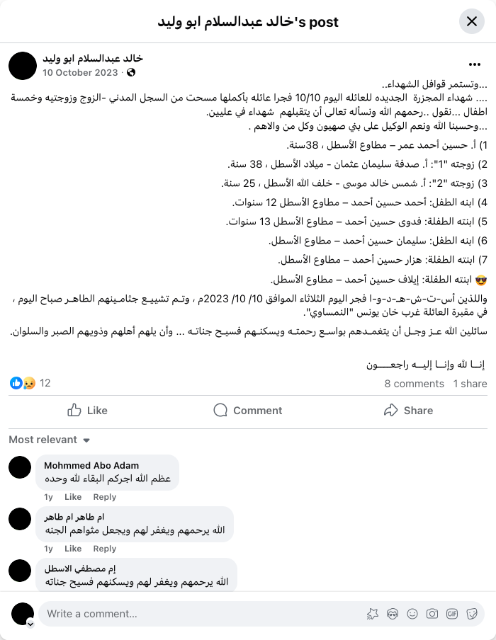 ... The martyrs of the new massacre of the family, today, October 10, at dawn, were an entire family erased from the civil registry - the husband, his two wives, and five children... We say... May God have mercy on them and we ask Him to accept them as martyrs in the highest heavens.