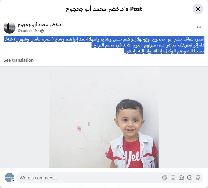 ابنتي عفاف خضر أبو جحجوح وزوجها: إبراهيم حسن وشاح، وابنها: أحمد إبراهيم وشاح ( عمره عامان وشهران) شه/داء إثر فص/ف مباشر على منزلهم اليوم الأحد في مخيم البريح.