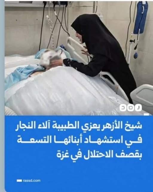 #Patience as Allah loves it# Dr. Alaa Al-Najjar.. Khansa of Palestine *Dr. Hamdi Al-Najjar took his wife Dr. Alaa to work and then returned to sit with their ten children, the eldest of whom is "Yahya" who is 12 years old, when a criminal missile launched by an Israeli aircraft hit the house, turning it into rubble and destruction and a fire devouring the children's bodies and causing severe injuries to Dr. Hamdi Al-Najjar. • Dr. Alaa was treating patients in the hospital and was surprised by the burned and torn bodies of children, some of whom she recognized as they were about to transfer them to the morgue. She did not find a single complete body of any of her children. She did not find a complete body to hug and say her final farewell to.