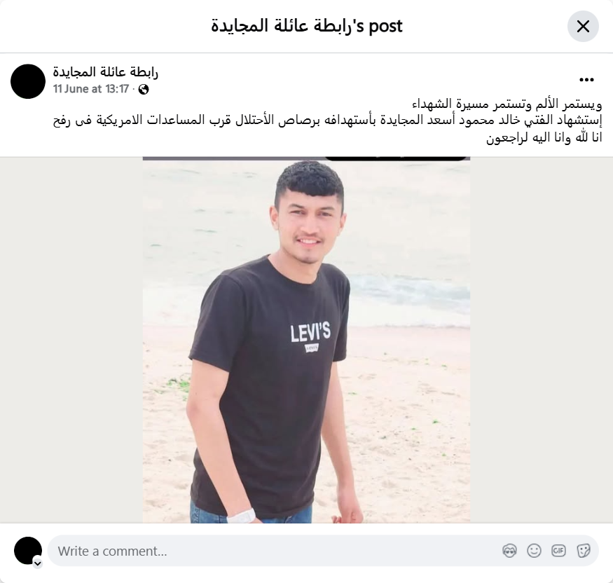 ويستمر الألم وتستمر مسيرة الشهداءإستشهاد الفتي خالد محمود أسعد المجايدة بأستهدافه برصاص الأحتلال قرب المساعدات الامريكية فى رفحانا لله وانا اليه لراجعون