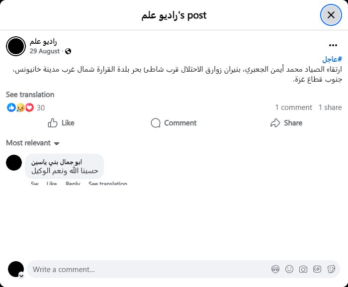 Fisherman Mohammed Ayman al-Ja'bari was killed by Israeli gunfire near the shore of al-Qarara town, northwest of Khan Yunis, in the southern Gaza Strip.
