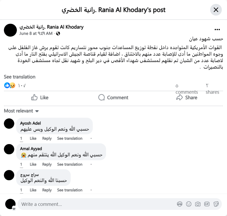القوات الأمريكية المتواجده داخل نقطة توزيع المساعدات جنوب محور نتساريم كانت تقوم برش غاز الفلفل على وجوه المواطنين ما أدى للإصابة عدد منهم بالاختناق