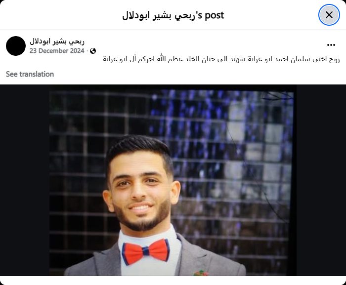 My sister's husband, Salman Ahmed Abu Ghraib, is a martyr who has gone to heaven. May God reward you, Abu Ghraib family.