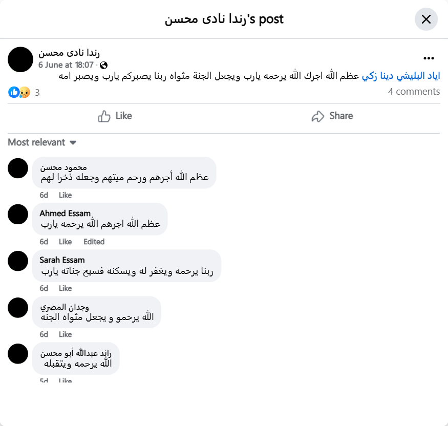 Ayad Al-Balaishi Dina Zaki May God reward you greatly. May God have mercy on him, my Lord, and make heaven his abode. May God give you patience, my Lord, and give patience to his mother.