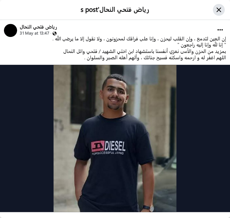 The eyes shed tears, the heart is saddened, and we are truly grieved by your departure. We say only what pleases Allah. “To Allah we belong and to Him we shall return.” With great sadness and sorrow, we offer our condolences for the martyrdom of my nephew, the martyr Fathi Wael Al-Nahhal. O Allah, forgive him, have mercy on him, and grant him a place in Your spacious gardens, and inspire his family with patience and solace.