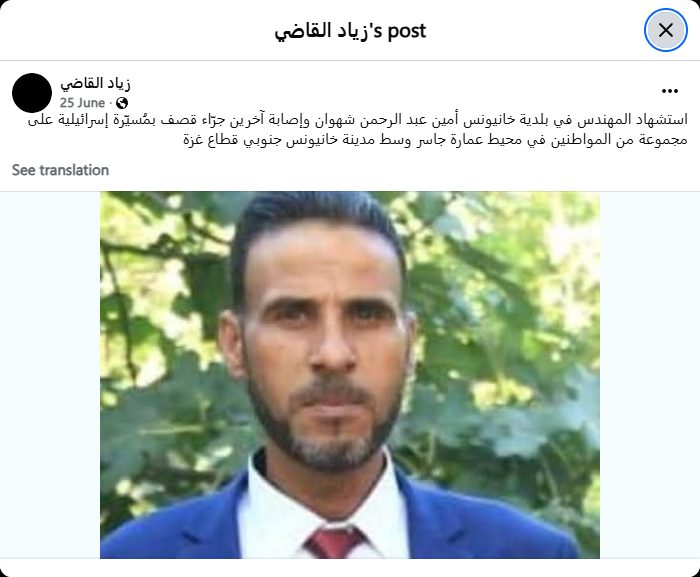 استشهاد المهندس في بلدية خانيونس أمين عبد الرحمن شهوان وإصابة آخرين جرّاء قصف بمُسيّرة إسرائيلية على مجموعة من المواطنين في محيط عمارة جاسر وسط مدينة خانيونس جنوبي قطاع غزة