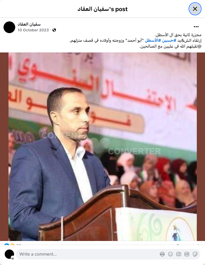 A second massacre against the Al-Astal family. The martyrdom of #Hussein #Al-Astal "Abu Ahmed", his wife and children, in the bombing of their home. May God accept them into the highest ranks with the righteous.