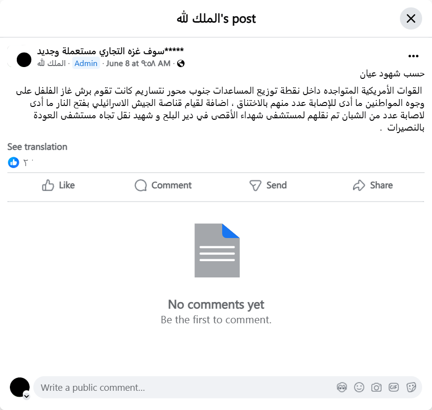 القوات الأمريكية المتواجده داخل نقطة توزيع المساعدات جنوب محور نتساريم كانت تقوم برش غاز الفلفل على وجوه المواطنين ما أدى للإصابة عدد منهم بالاختناق