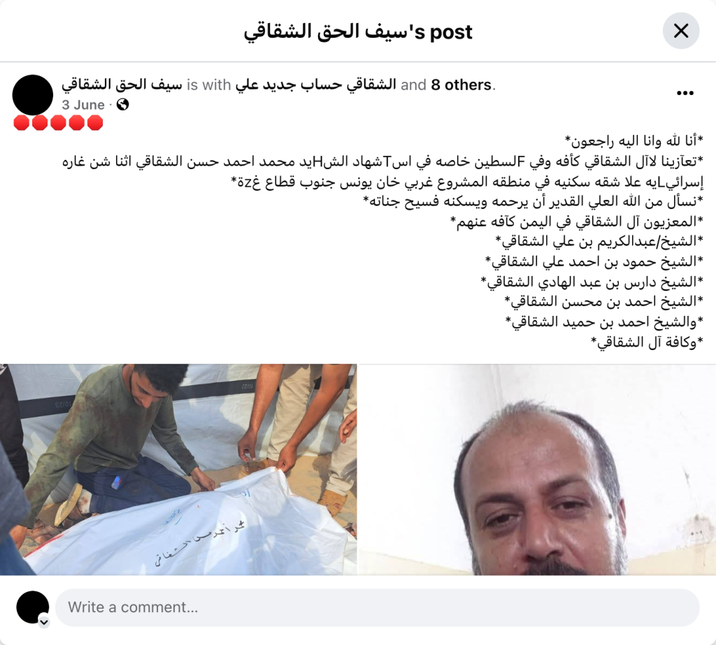 *We belong to Allah and to Him we shall return** Our condolences to the entire Al-Shaqaqi family and to Palestine in particular for the martyrdom of the martyr Muhammad Ahmad Hasan Al-Shaqaqi during an Israeli raid on a residential apartment in the Al-Mashrou’ area, west of Khan Yunis, south of the Gaza Strip.** We ask God Almighty to have mercy on him and to grant him a place in His spacious gardens.** Our condolences to the Al-Shaqaqi family in Yemen as a whole:** Sheikh Abdul Karim bin Ali Al-Shaqaqi, Sheikh Hamoud bin Ahmed Ali Al-Shaqaqi, Sheikh Daris bin Abdul Hadi Al-Shaqaqi, Sheikh Ahmed bin Mohsen Al-Shaqaqi, Sheikh Ahmed bin Hamid Al-Shaqaqi, and all the Al-Shaqaqi family.*