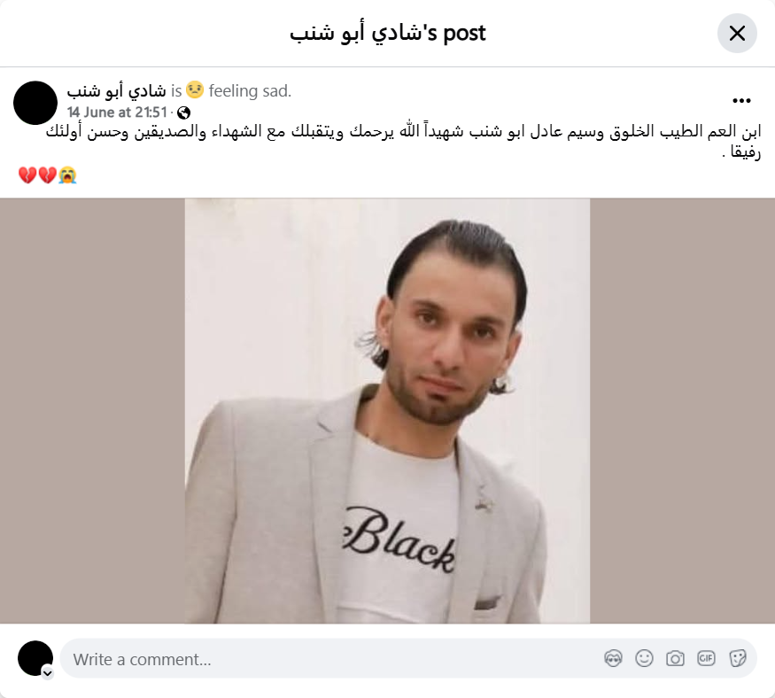 My good and well-mannered cousin, handsome Adel Abu Shanab, was martyred. May God have mercy on you and accept you with the martyrs and the righteous. What excellent companions they are.