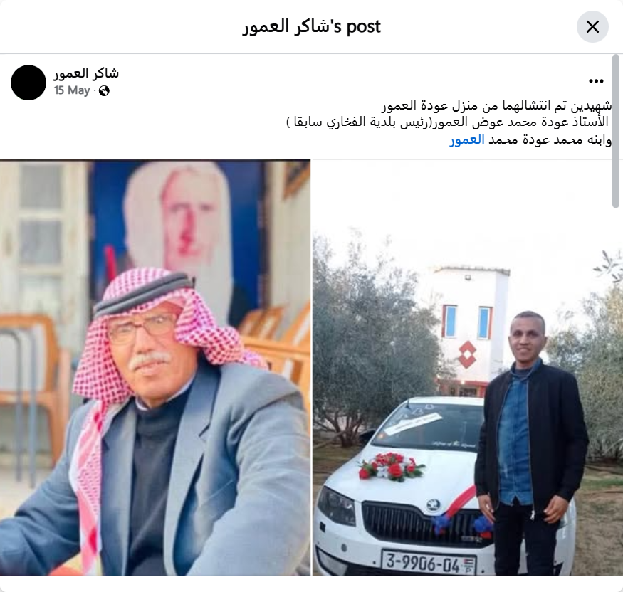 شهيدين تم انتشالهما من منزل عودة العمور الأستاذ عودة محمد عوض العمور(رئيس بلدية الفخاري سابقا )وابنه محمد عودة محمد العمور