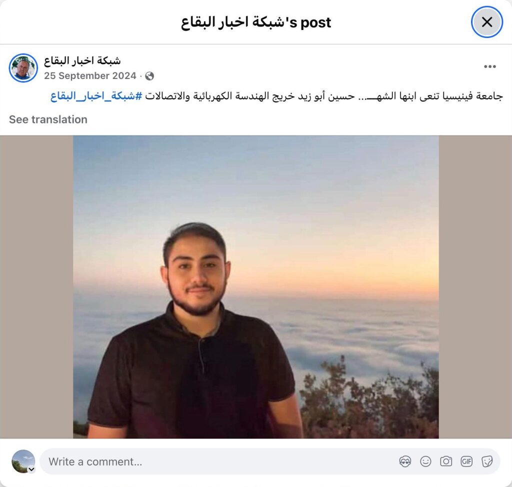 Venice University mourns the loss of its son, the martyr Hussein Abu Zeid, a graduate in Electrical and Communications Engineering. #Bekaa_News_Network