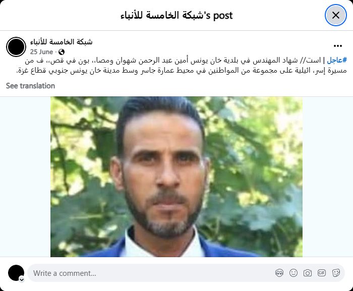 #Urgent | // The engineer in the Khan Yunis Municipality, Amin Abdul Rahman Shahwan, was martyred and there are injured in an Israeli drone strike on a group of citizens in the vicinity of the Jasser Building in the center of Khan Yunis, south of the Gaza Strip.
