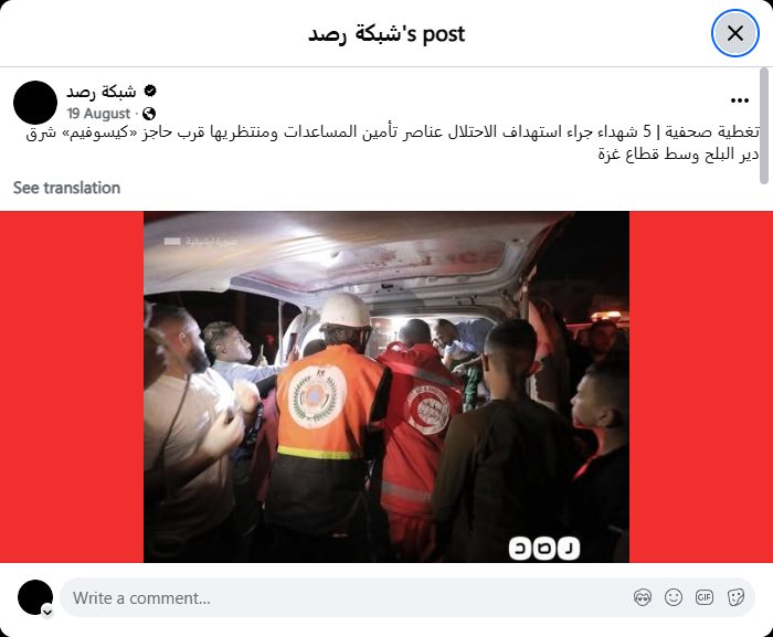 Press coverage | 5 martyrs as a result of the occupation's targeting of aid workers and those waiting for aid near the Kissufim checkpoint, east of Deir al-Balah, in the central Gaza Strip.
