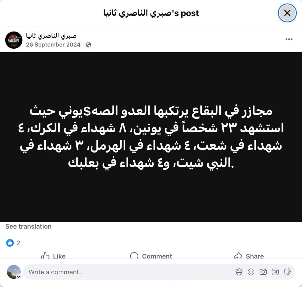 مجازر في البقاع يرتكبها العدو الصه$يوني حيث استشهد ٢٣ شخصاً في يونين، ٨ شهداء في الكرك، ٤ شهداء في شعت، ٤ شهداء في الهرمل، ٣ شهداء في النبي شيت، و٤ شهداء في بعلبك.