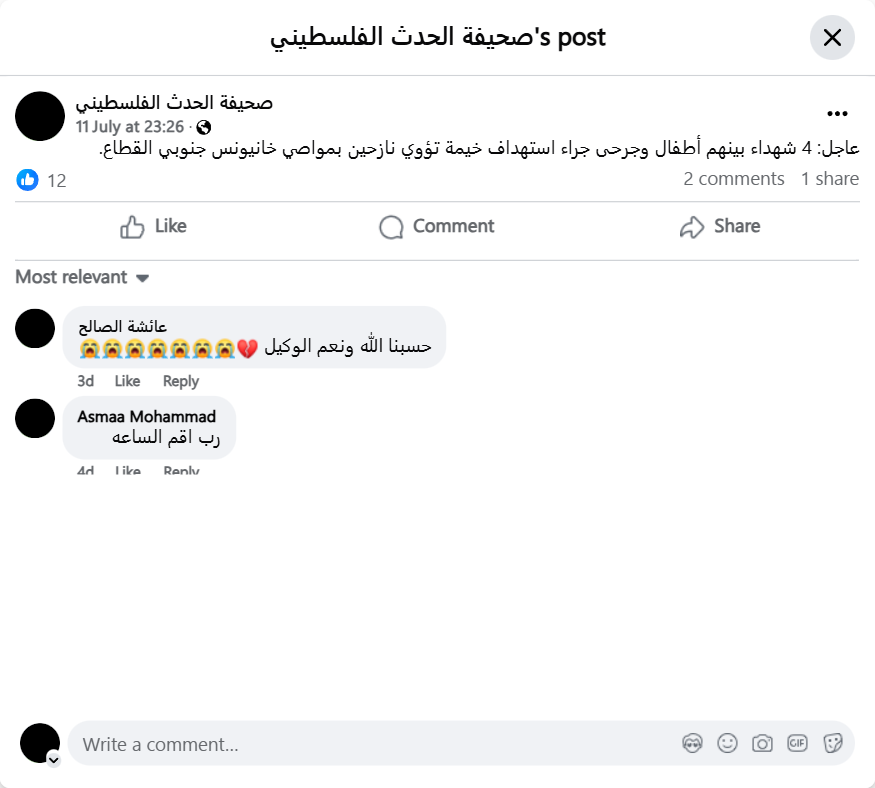 Urgent: 4 martyrs, including children, and wounded as a result of targeting a tent sheltering displaced people in Mawasi Khan Yunis, south of the Gaza Strip. All reactions: 1,212 2 comments 1 share Like Comment Share