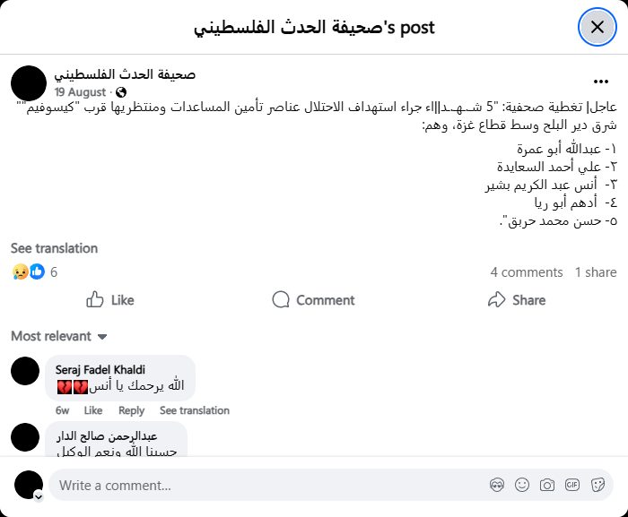 Urgent | Press coverage: "5 martyrs as a result of the occupation targeting aid workers and those waiting for them near "Kissufim" east of Deir al-Balah in the central Gaza Strip. They are: