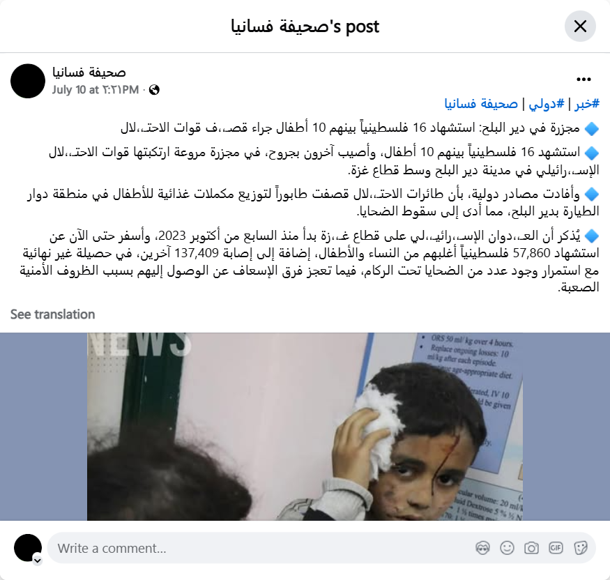 International sources reported that Israeli aircraft bombed a queue distributing nutritional supplements to children in the al-Tayyarah roundabout area of Deir al-Balah, resulting in casualties.