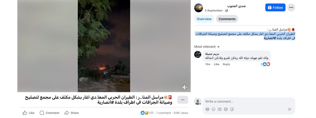 Archive URL: https://airwars.org/source/www-facebook-com-%d8%b5%d8%af%d9%89-%d8%a7%d9%84%d8%ac%d9%86%d9%88%d8%a8-2025-09-03-090000/