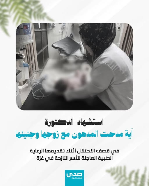 Press coverage: Dr. Aya Madhat al-Madhoun, along with her husband and unborn child, was killed by Israeli shelling while providing medical care to displaced people in the Gaza Strip.