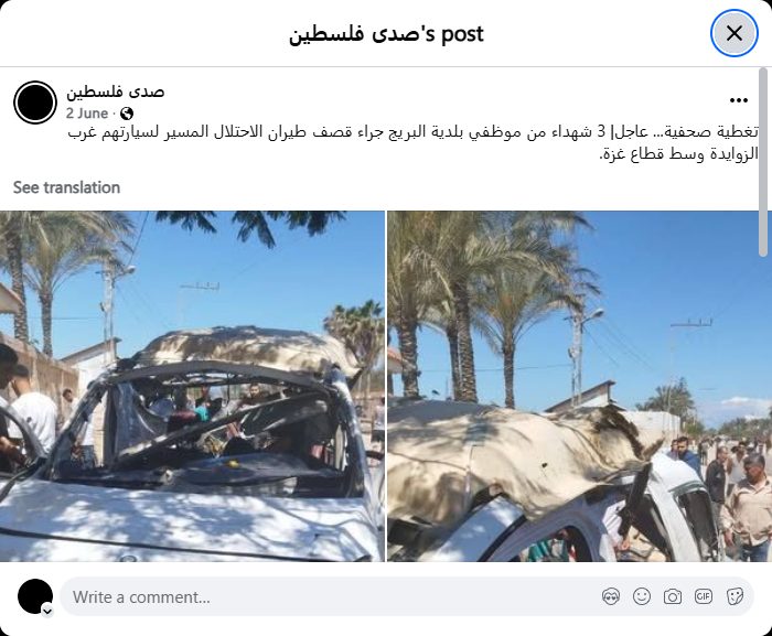 Press coverage... Urgent | Three Al-Bureij municipality employees were martyred when an Israeli drone bombed their vehicle west of Al-Zawayda, in the central Gaza Strip.