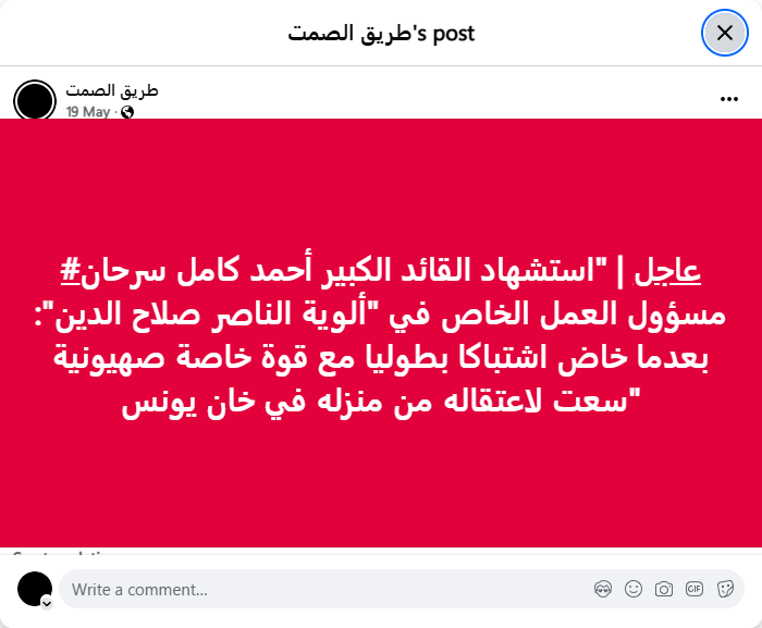 #عاجل | "استشهاد القائد الكبير أحمد كامل سرحان مسؤول العمل الخاص في "ألوية الناصر صلاح الدين": بعدما خاض اشتباكا بطوليا مع قوة خاصة صهيونية سعت لاعتقاله من منزله في خان يونس"#عاجل | "استشهاد القائد الكبير أحمد كامل سرحان مسؤول العمل الخاص في "ألوية الناصر صلاح الدين": بعدما خاض اشتباكا بطوليا مع قوة خاصة صهيونية سعت لاعتقاله من منزله في خان يونس"