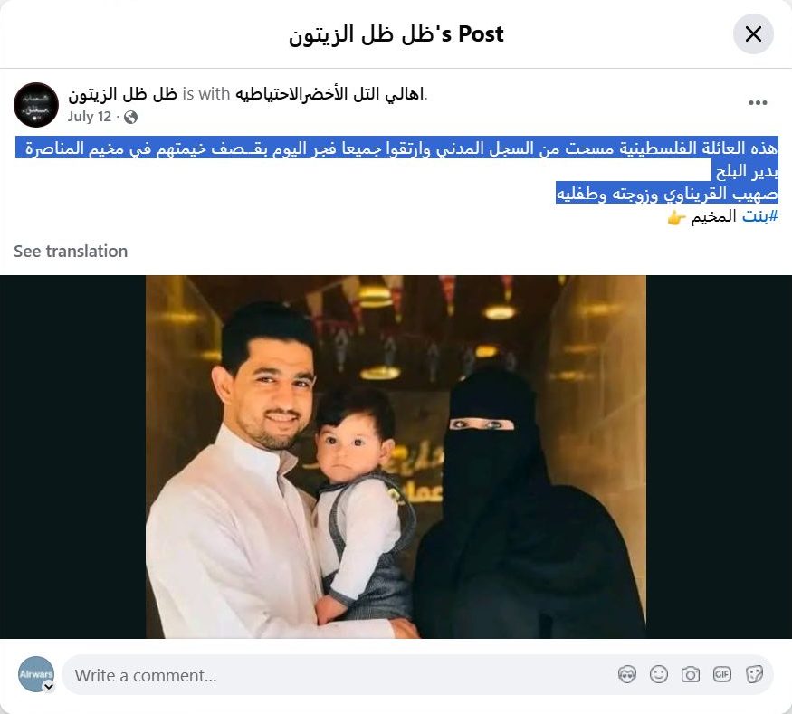 This Palestinian family was erased from the civil registry and all perished this morning when their tent in the Al-Manasra camp in Deir al-Balah was bombed.