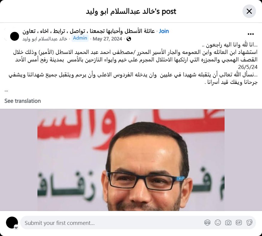 The martyrdom of our family member, cousin, and neighbor, the freed prisoner Mustafa Ahmed Abdel Hamid Al-Ashtal (Al-Amir). This occurred during the barbaric bombing and massacre committed by the criminal occupation forces against the tents and shelters of the displaced in Rafah yesterday, Sunday 5/26/24.