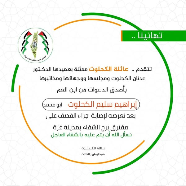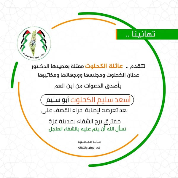 The Al-Kahlout family, represented by its dean, Dr. Adnan Mahmoud Al-Kahlout "Abu Bilal", its council, dignitaries and mukhtars, extends its sincere prayers to our cousins, #Asaad_Saleem_Salama_Al-Kahlout Abu Salim, his brother #Ibrahim_Saleem_Salama_Al-Kahlout Abu Muhammad, and his son #Muhammad_Ibrahim_Saleem_Al-Kahlout, after they were injured by shrapnel following the bombing of Burj Al-Shifa intersection in Gaza City. We ask God to grant them a speedy recovery. #Media_Committee#Al-Kahlout_Family
