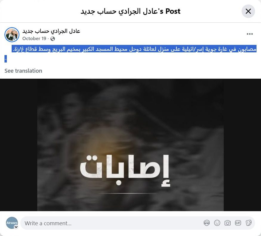 Several people were injured in an Israeli airstrike on the home of the Duhal family near the Grand Mosque in al-Bureij refugee camp in the central Gaza Strip.