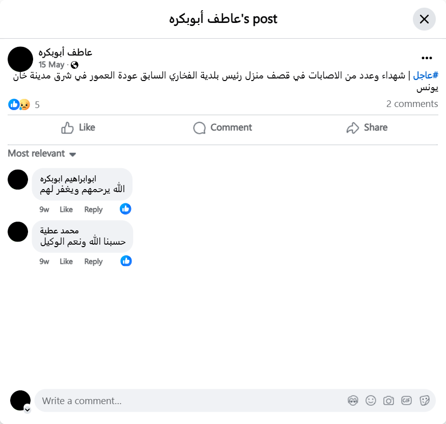 Archive URL: https://airwars.org/source/www-facebook-com-%d8%b9%d8%a7%d8%b7%d9%81-%d8%a3%d8%a8%d9%88%d8%a8%d9%83%d8%b1%d9%87-pfbid02gnrbk8in3gvwx9duuj8lbfibrn5rzgdvhx39nvfznnfqcv8mqxxdstvisyfvbfztl-2025-05-15-100000/