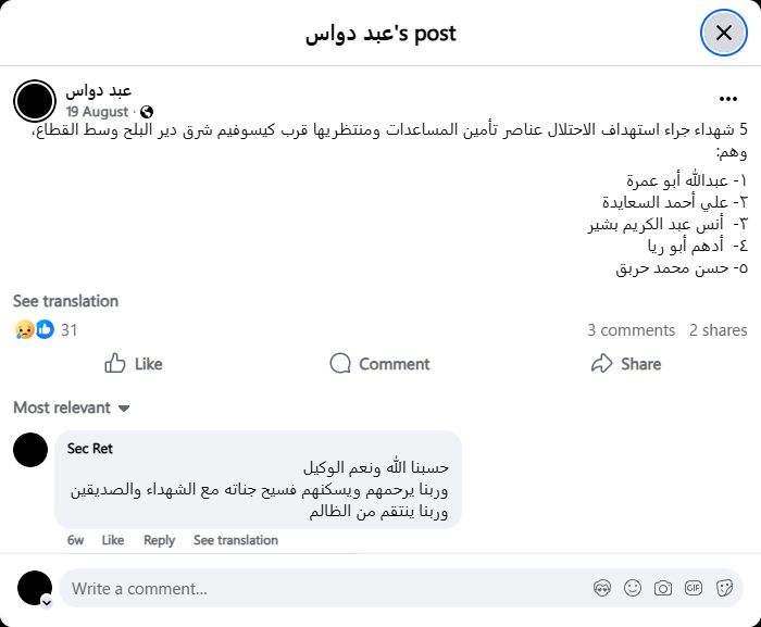 Five martyrs were killed as a result of the occupation forces targeting aid workers and those waiting for them near Kissufim, east of Deir al-Balah, in the central Gaza Strip. They are: