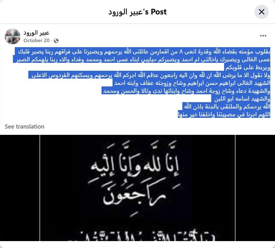 With hearts believing in God's decree and destiny, I mourn eight of my beloved family members. May God have mercy on them and grant us patience in their absence. May God grant patience to my dear uncle, and to my aunt, Umm Ahmad, and to my dear cousins Ahmad, Muhammad, Fida, and Alaa. May God inspire you with patience and strengthen your hearts. We say only what pleases God: "To God we belong, and to Him we shall return." May God grant you a great reward. May God have mercy on them and grant them the highest Paradise. The dear martyr Ibrahim Hassan Ibrahim Washah, his wife Afaf, and their son Ahmad; the martyr Duaa Washah, wife of Ahmad Washah, and their children Nada, Tala, Hassan, and Muhammad; and the martyr Osama Abu Al-Laban. May God have mercy on you, and may we meet again in Paradise, God willing. O God, reward us for our loss and replace it with something better.
