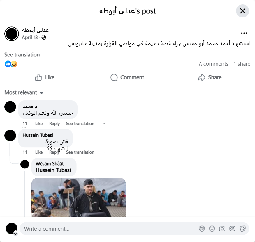 Ahmed Mohammed Abu Mohsen was killed as a result of the bombing of a tent in the Mawasi al-Qarara area of Khan Yunis.