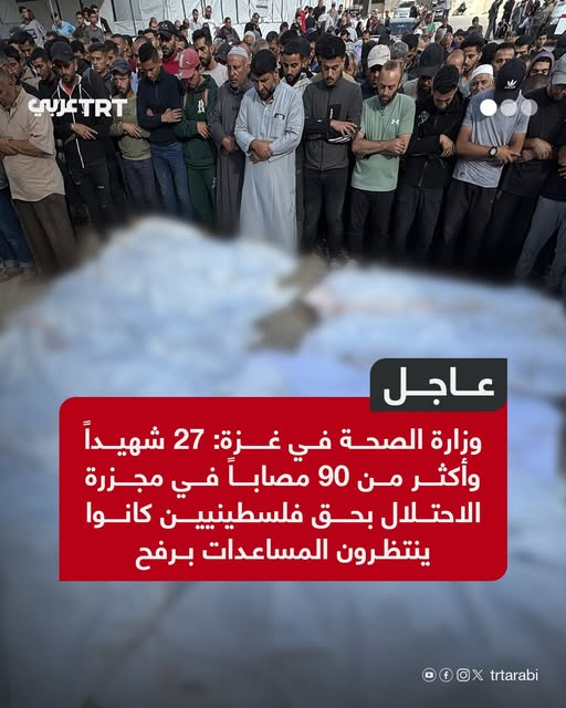 Urgent | Gaza Ministry of Health: 27 martyrs and more than 90 injured in the occupation's massacre of Palestinians waiting for aid in Rafah.