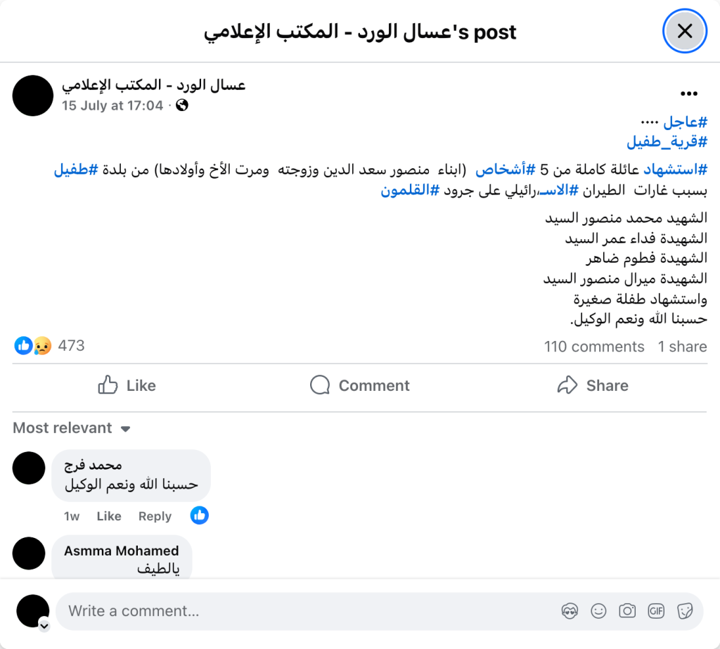 #Urgent 0000 #Tufail_Village #Martyrdom of an entire family of 5 #people (sons of Mansour Saadeddine, his wife, the brother's wife and her children) from the town of #Tufail due to #Israeli air raids on the outskirts of #Qalamoun. Martyr Muhammad Mansour Al-Sayyid, Martyr Fida Omar Al-Sayyid, Martyr Fatoum Daher, Martyr Miral Mansour Al-Sayyid and the martyrdom of a little girl. God is sufficient for us, and He is the best Disposer of affairs.