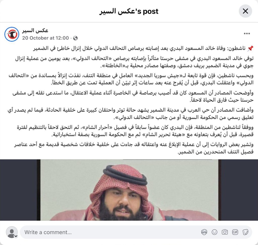 توفي خالد المسعود البدري في مشفى حرستا متأثراً بإصابته برصاص «التحالف الدولي»، بعد يومين من عملية إنزال جوي في مدينة الضمير بريف دمشق، وصفتها مصادر محلية بـ«الخاطئة».