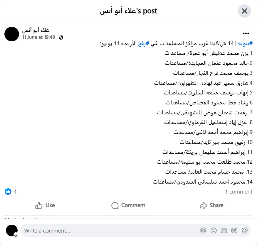 #تنويه | 14 ش&يدًا قرب مراكز المساعدات في #رفح الأربعاء 11 يونيو:1.يزن محمد عطيش أبو عمرة/ مساعدات 2.خالد محمود عثمان المجايدة/مساعدات3.يوسف محمد فرح النجار/مساعدات4.طارق سمير عبدالهادي الطهراوي/مساعدات 5.إيهاب يوسف جمعة السلوت/مساعدات 6.رشاد عطا محمود القصاص/مساعدات7. رفعت شعبان عوض البشهيقي/مساعدات 8. غزل إياد إسماعيل الفرماوي/مساعدات9.إبراهيم محمد أحمد لافي/مساعدت10.رفيق محمد جبر تايه/مساعدات11.إبراهيم أسعد سليمان بريكة/مساعدات 12.محمد طلعت محمد أبو سليمة/مساعدات13. محمد حسام محمد العابد/ مساعدات14.محمود أحمد سليماني السدودي/مساعدات