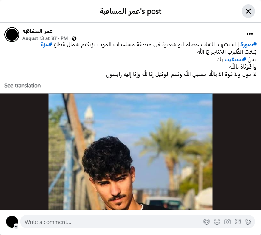 #صورة | استشهاد الشاب عصام ابو شعيرة فى منطقة مساعدات الموت بزيكيم شمال قطاع #غزة.