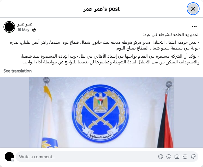 المديرية العامة للشرطة في غزة:- ندين جرمية اغتيال الاحتلال مدير مركز شرطة مدينة بيت حانون شمال قطاع غزة، مقدم/ زاهر أيمن عليان، بغارة جوية في منطقة قليبو شمال القطاع صباح اليوم.- نؤكد أن الشركة مستمرة في القيام بواجبها في إسناد الأهالي في ظل حرب الإبادة المستعرة ضد شعبنا، والاستهداف المتكرر من قبل الاحتلال لقادة الشرطة وعناصرها لن يدفعنا للتراجع عن مواصلة أداء الواجب.