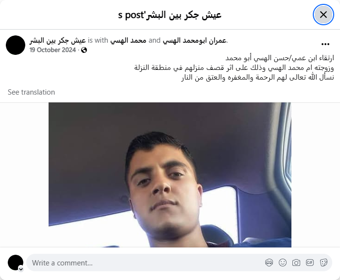 The martyrdom of my cousin, Hassan Al-Hissi, Abu Muhammad, and his wife, Umm Muhammad Al-Hissi, as a result of the bombing of their home in the Al-Nazla area. We ask God Almighty to have mercy on them, forgive them, and save them from Hellfire.