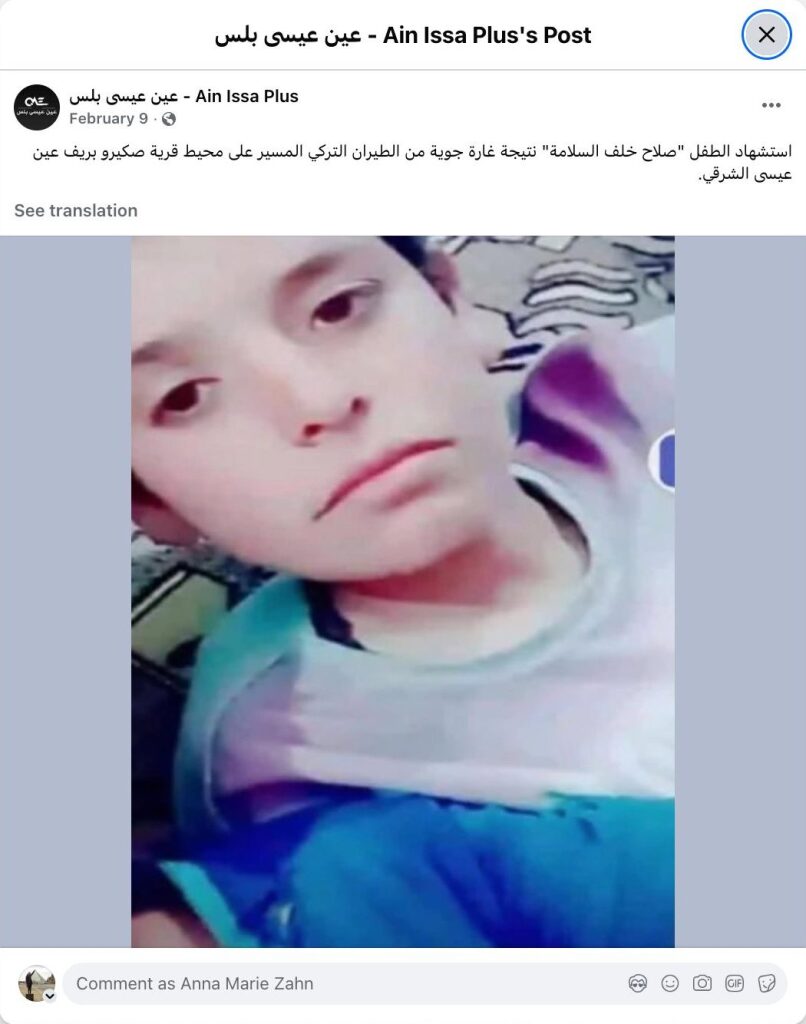 استشهاد الطفل "صلاح خلف السلامة" نتيجة غارة جوية من الطيران التركي المسير على محيط قرية صكيرو بريف عين عيسى الشرقي.