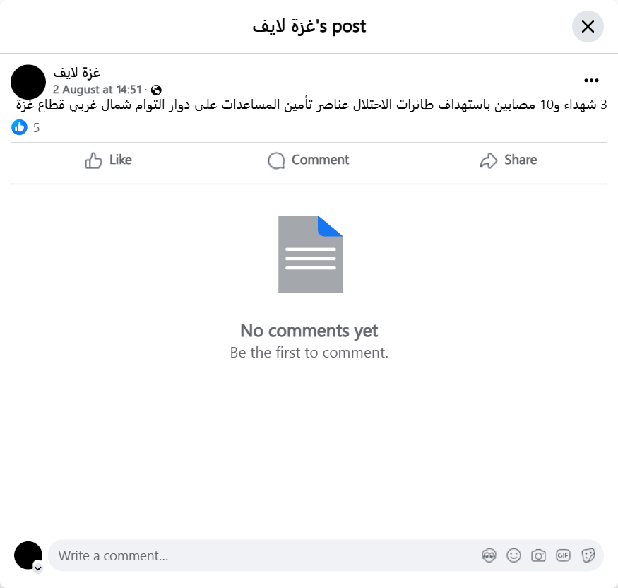 Archive URL: https://airwars.org/source/www-facebook-com-%d8%ba%d8%b2%d8%a9-%d9%84%d8%a7%d9%8a%d9%81-pfbid02ujqqlv7elmzqrjxthaz8exxf1xeqfafmiyj4xyymgpgep8tpdjbtnbexk98aww68l-2025-08-02-125100/